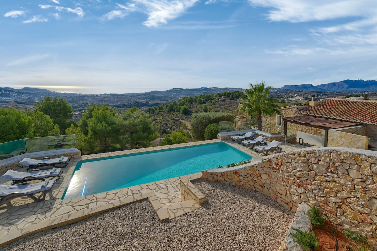 "Villa Sunset Moraira": disfruta de los días de ensueño en una villa modernizada de estilo español para hasta 8 huéspedes. LO más destacable: - piscina privada (con calefacción) - Gran zona exterior con vistas al sur. - Cocina exterior con barbacoa. - aire acondicionado, ventiladores y calefacción en todas las habitaciones. - Muebles de alta calidad - 3 dormitorios con camas de somier. - 2 baños modernos con ducha y bañera. - Cocina totalmente equipada. - Wifi rápido. - Televisión inteligente - Ubicación tranquila, cerca de la playa. ☆ "¡La villa de Clio es una joya absoluta!"