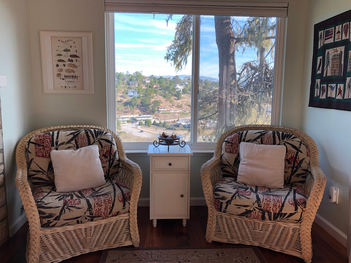 - Please note: cannot accommodate young children or pets - Unique craftsman style - Short stroll to Nature Trail, on Park Hill, up the hill from park and beach - Window seat and deck w/distant ocean view - Free Wifi, Smart TV with free Netflix - Stairs Please note: We cannot accommodate young children or pets. Two bedrooms, 2 baths on different levels for quiet and privacy. A peaceful art-filled retreat near nature trails, park and beach. Note: There is an additional fee for more than 2 guests.