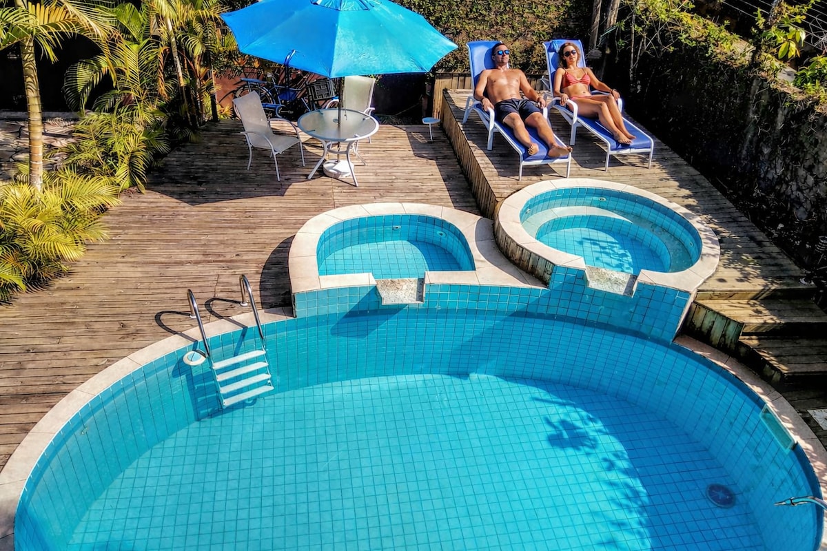Escápate de la rutina y relájate en un chalet privado rodeado de naturaleza, perfecto para parejas💑. Disfruta de un exclusivo jacuzzi climatizado, cama tamaño king, aire acondicionado y zona de barbacoa, todo a solo 500 metros de la playa. Ubicación increíble en el sur de Ilhabela: cerca de las playas más hermosas, restaurantes y mercado, pero con la tranquilidad de un refugio en el bosque 🌿🌊 El chalet cuenta con: - 1 habitación - 2 baños. • Cocina privada. • Wi-Fi • TV inteligente • Jacuzzi para relajarse. • Parrilla privada