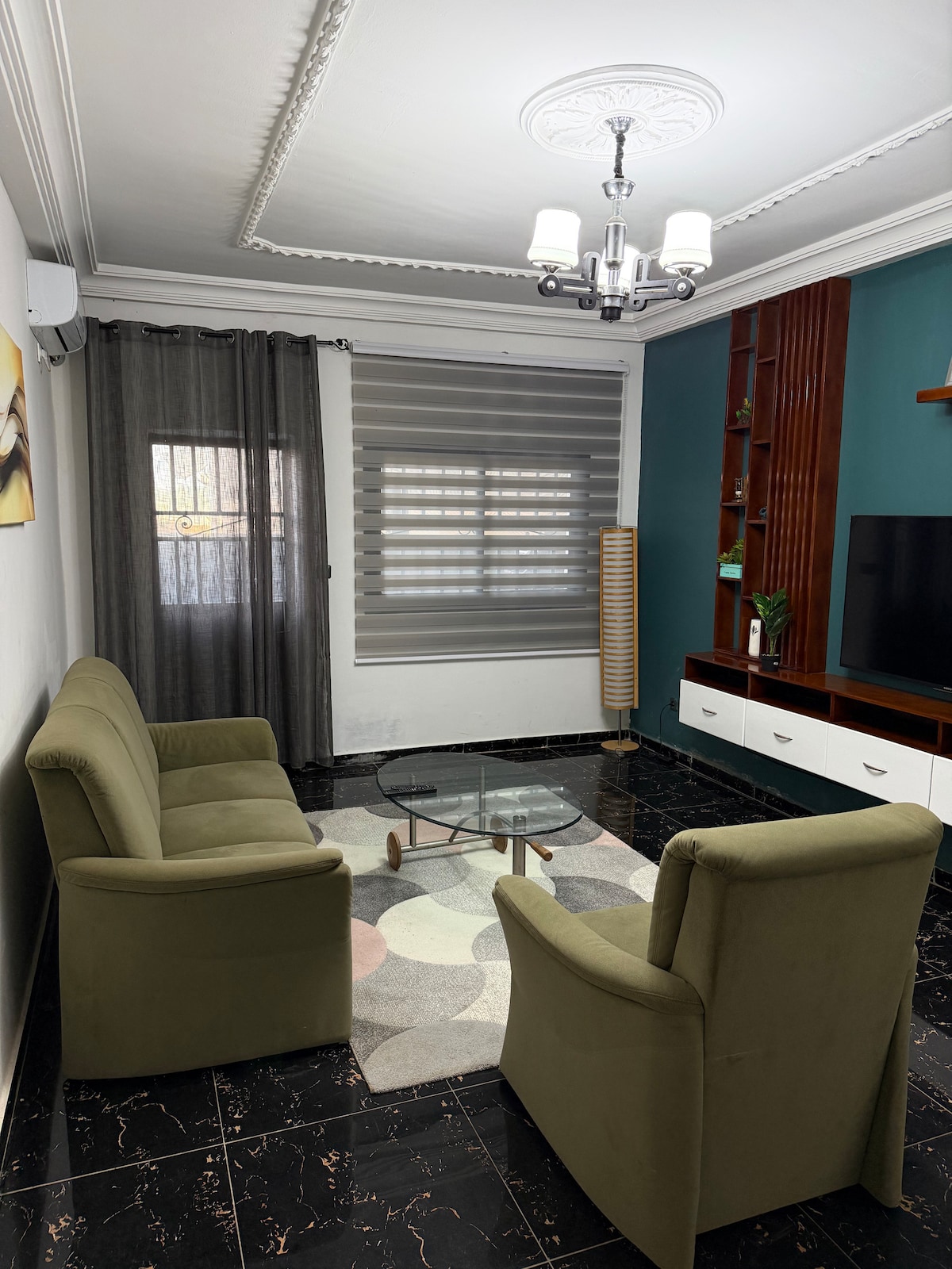 Apartamento amueblado de dos dormitorios situado en Makepe, Duala, al lado de la carretera. Totalmente equipado, es ideal para cursos y estancias largas. Equipado con dos balcones, internet ilimitado de alta velocidad (fibra óptica), Canal Sat, una Smart TV con Netflix, Amazon Prime y YouTube integrados, seguridad 24/7, cámaras de vigilancia en el edificio, estacionamiento gratuito, calentador de agua, lavadora, cocina equipada, aire acondicionado en todas las habitaciones, dos ventiladores, grupo electrógeno.