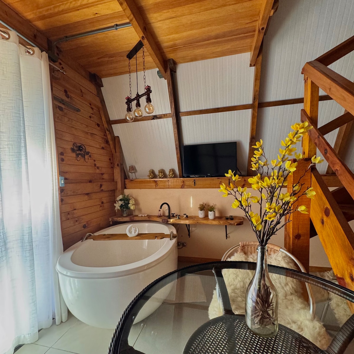 Nuestras cabañas fueron cuidadosamente diseñadas para proporcionar una sensación de conexión con la naturaleza y la comodidad al mismo tiempo. Cada cabaña tiene una peculiaridad, que te lleva a apreciar el verde del bosque, el sonido del arroyo y el canto de los pájaros incluso desde el interior de las cabañas. Puedes disfrutar del calor de la chimenea, acompañado de una copa de vino o un relajante baño en la bañera de hidromasaje