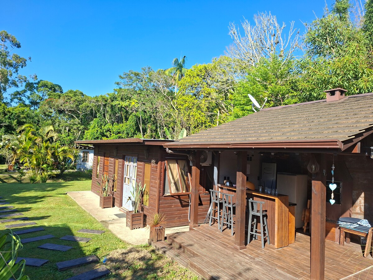Cabaña rústica, encantadora y confortable en la zona central de Garopaba. La casa tiene sala de estar, baño, cocina equipada, altillo y zona de terraza con barbacoa. Aire acondicionado 12.000btus Internet WIFI fibra óptica 500 Mbps. Smart TV de 43 pulgadas con aplicaciones, Youtube y Netflix. Hermosa piscina natural con agua corriente, limpia y fresca. Para uso exclusivo de los huéspedes. Estacionamiento en el terreno con puerta electrónica. Lugar familiar, tranquilo y silencioso. Excelente para vacaciones y playas.