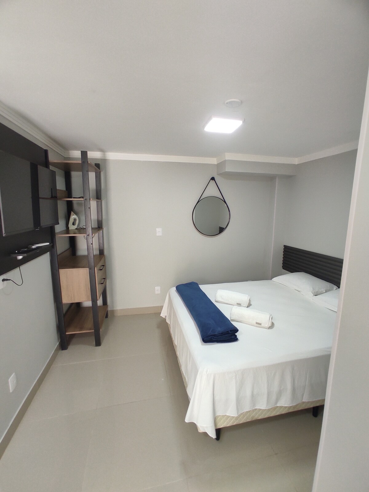 Sofisticado apartamento tipo estudio ubicado a 800 metros del parque Vila Germânica, lugar de eventos como el Oktoberfest. Rodeado de restaurantes, bares y supermercados. Todo para su comodidad: Smart TV 50" Samsung, aire acondicionado split, ducha de gas, wifi fibra 240mb, cocina completa con heladera Brastemp, microondas, horno, estufa, campana extractora, cafetera, purificador de agua, lava y seca, armarios, y por supuesto ¡una cama queen con el mejor colchón!