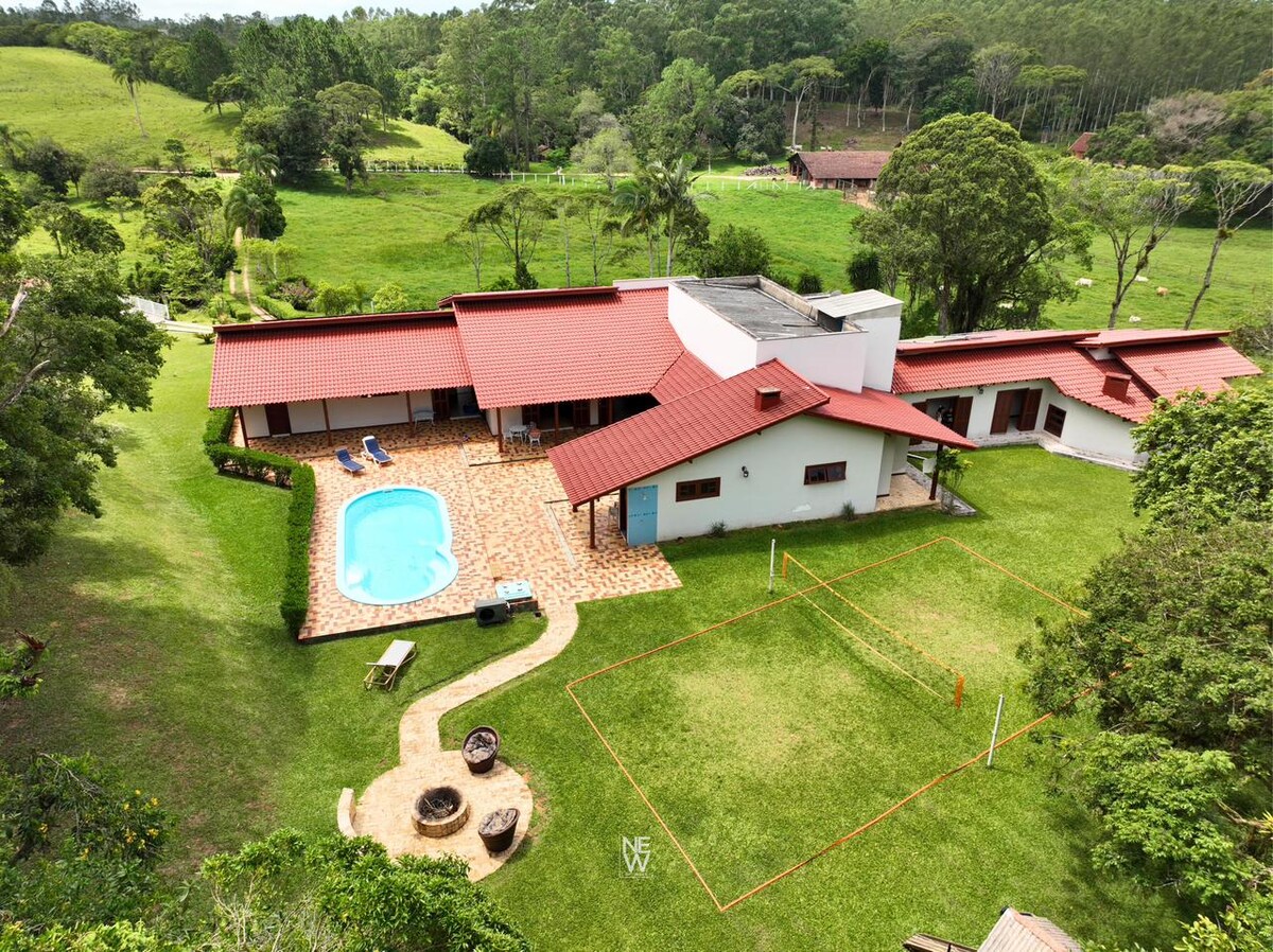Casa de campo completa para Famílias e Grupos em Canelinha. Conecte-se com a natureza com total conforto. ✔ 5 quartos (todos ar cond) ✔ Piscina aquecida e quadra privativa ✔ Adega com lareira + sala de jogos ✔ Churrasqueira, brinquedoteca e playground ✔ Pet friendly + segurança 24h ✔ Sala ampla com Smart TV e Wi-Fi 📍 Localização estratégica • Localizada a 20 min dos outlets de SC • 25km do Santuário Madre Paulina • Apenas 1,5km da rodovia • Próxima a atrativos turísticos e natureza
