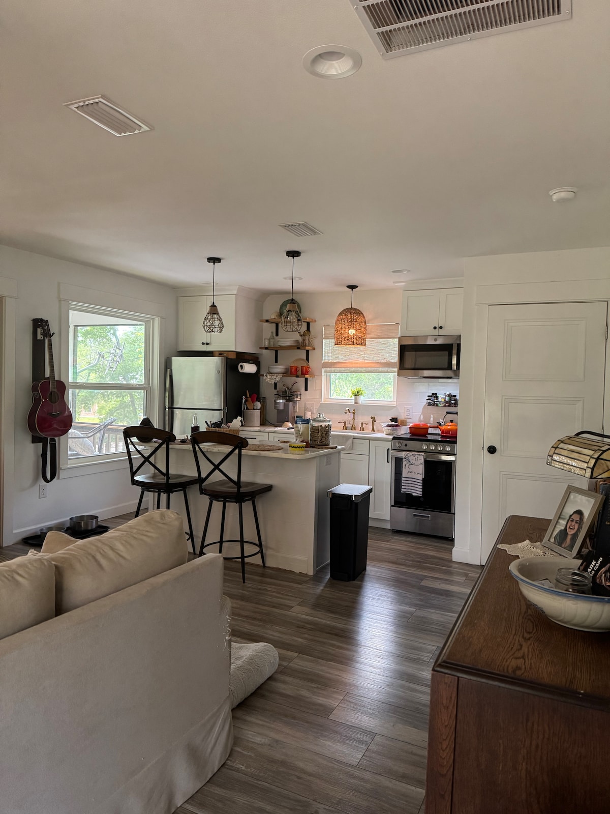 Escápate a nuestra acogedora y pequeña casa privada escondida bajo varios árboles de sombra maduros en casi 3 acres en una tranquila calle sin salida con vecinos limitados, cuidadosamente diseñada y que ofrece la combinación perfecta de encanto rústico y comodidad moderna. • Lofts dobles para tener más espacio para dormir, más un sofá cama futón adicional (capacidad para 5 personas en total) • Baño/ducha privados • Cocina con nevera, fogones, horno, café Keurig y muchos artículos esenciales. Aire acondicionado frío. 2 televisores inteligentes, wifi de alta velocidad GRATIS Fogata, parrilla, terraza, se admiten 2 mascotas