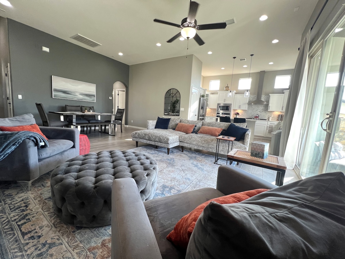 ¡Ven a alojarte en nuestra nueva casa! Hermosos tres dormitorios y dos baños con una amplia sala de estar. Disfruta de un buen descanso nocturno en la cama tamaño king ubicada en el dormitorio principal, que también tiene un escritorio para cualquier negocio que necesites atender. La casa se encuentra a pocos minutos del centro comercial Outlet y del centro comercial de nueva construcción.