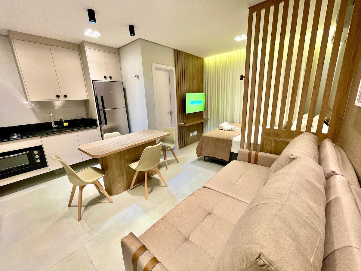 Encantador loft nuevo a solo tres manzanas del mar. Con un hermoso diseño, cómodo, nuestro espacio es ideal para parejas, con capacidad para un máximo de cuatro personas. . El espacio incluye: Piscina y barbacoa; Sala de estar integrada con cocina moderna y equipada; Cama de matrimonio; Sofá cama; Wi-Fi; Ropa de cama y toallas; Aire acondicionado; Amplia vista de la ciudad y la puesta de sol; Ubicación privilegiada, a solo 2 minutos a pie de la playa, con fácil acceso a restaurantes, bares y atracciones locales.