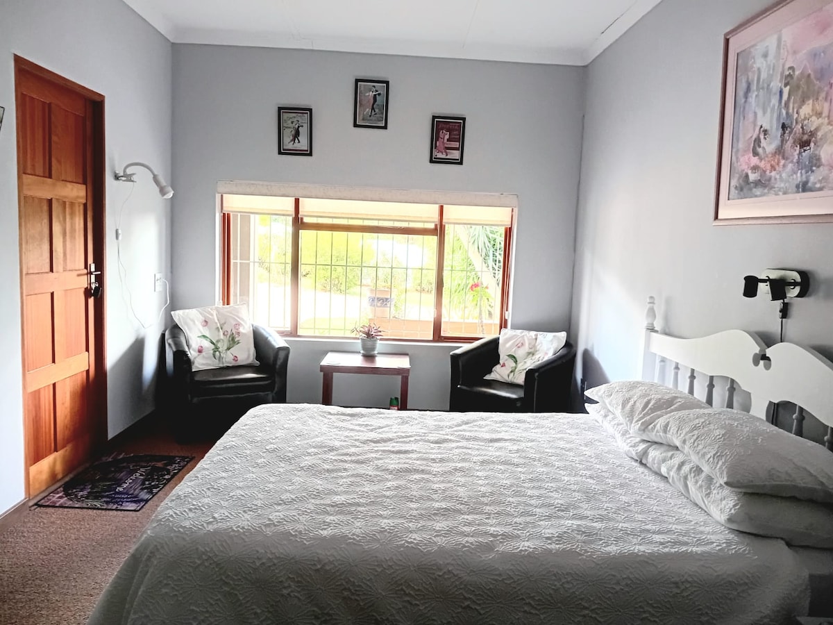 Superb non-smoking garden cottage at the back of the main house. It sleeps 4 guests in two very luxurious en-suite double bedrooms (Air conditioned) with spacious TV- lounge and small kitchenette. (Well equipped). Expect good quality linen and fluffy towels and unexpected little luxuries. A sparkling pool, free parking and Fibre Wi-Fi on the premises. Guests can enjoy the garden and pool at leisure. It is completely separate and private as only one other person resides in the main house.