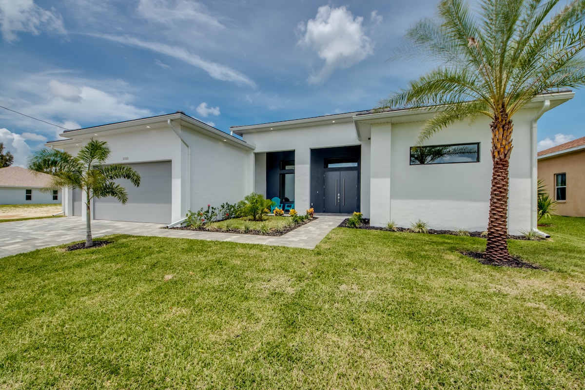 Unwind Cape Coral te da la bienvenida al soleado suroeste de Florida, cerca de magníficas playas, pesca, conchas, entrenamiento de primavera de los Minnesota Twins y mucho más. Ven a disfrutar de esta casa de nueva construcción con piscina climatizada, kayaks, sala de juegos climatizada y refrigerada (PlayStation 5), acceso al golfo (canal de agua salada), televisores 4k oled y muchas más comodidades refrescantes. Te encantará esta casa limpia y luminosa con una decoración encantadora. ¡Ubicado en el codiciado barrio de Pelican en el suroeste de Cape Coral!
