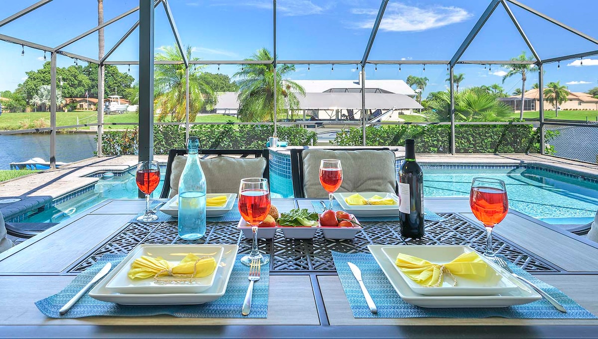 Sea You at the Cape, the perfectly located SW Florida getaway. Enjoy this stunning home on a wide canal. Watch the boats go by from your saltwater infinity edged pool, hot tub, or from the newly renovated interior. This home will help you breathe easier, laugh more, relax, and rejuvenate. Then hop on the provided kayak or bicycles to explore Cape Harbor and the many restaurants, shops, bars, and activities of Cape Coral. By boat enjoy the gulf and beaches just a mere 20 minutes away. Enjoy!