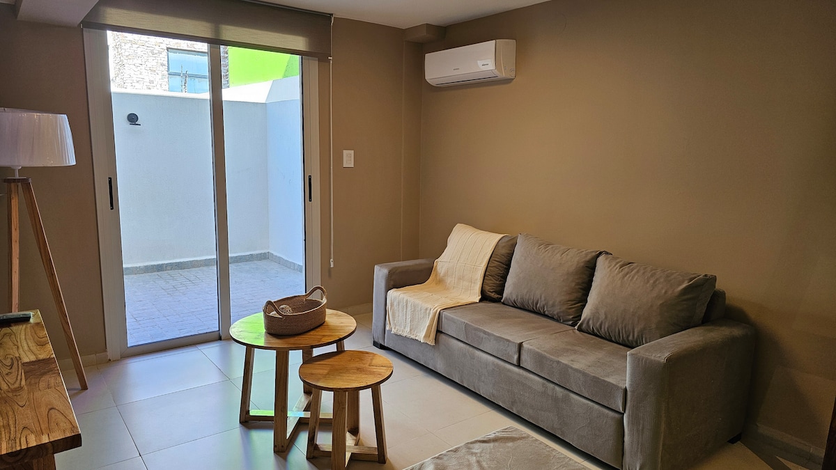 Sentí Mendoza como tu casa. Ubicada en el corazón de la ciudad. Zona de bares y plazas más importantes de Mendoza. A una cuadra de la peatonal. Disfruta de un espacio cómodo y atractivo. El apartamento es a estrenar, de 50 mts cubiertos y cuenta con una habitación, con cama superior y vestidor, TV y aire ac. f/c, baño, con secador de pelo, shampoo, acondicionador, cocina con península de piedra, living con TV, sofá cama y aire ac f/c, lavarropas. Estacionamiento de pago. ¡Infusiones de cortesía!