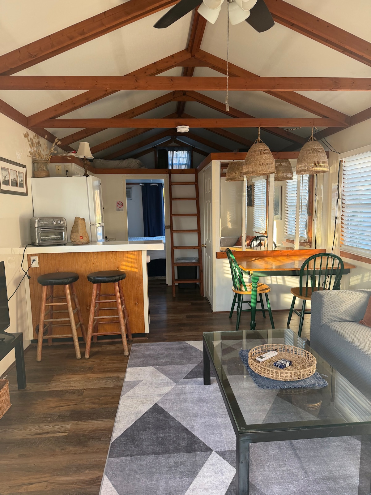 The Space Private Bedroom (Queen Bed) Loft sleeping area (great for extra guests) Cozy living room with sofa + TV Fully equipped kitchen (stove, microwave, fridge) Full bathroom with shower Private front deck + rooftop deck with panoramic views Sleeps: 2–4 guests comfortably Rooftop deck Direct waterfront Incredible sunset views Peaceful, relaxing environment Kitchen Sleeping Setup Bedroom: Queen bed Loft: 2 additional sleeping spots Living room: Couch option