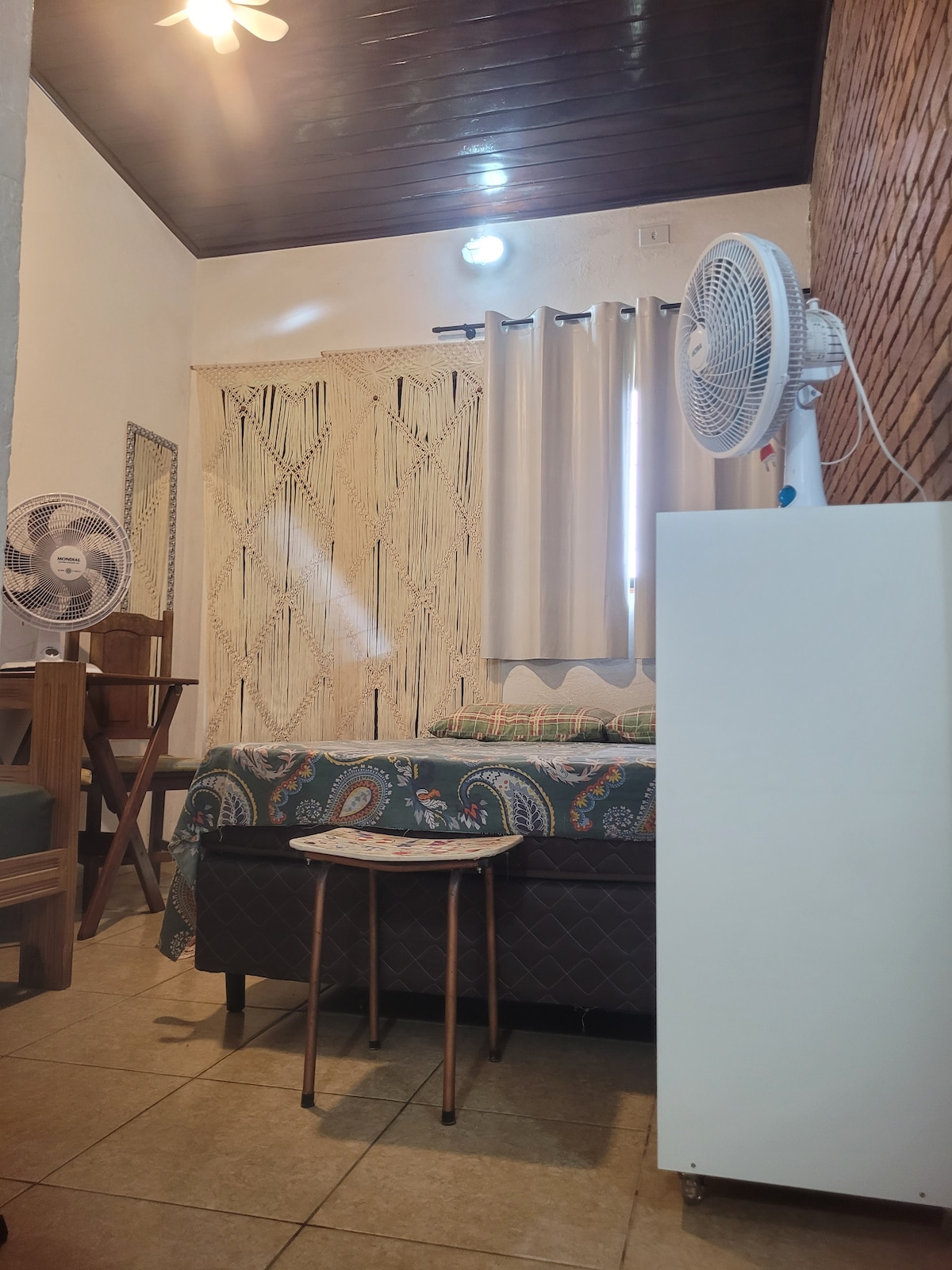 Suíte ampla com entrada independente. Cama Queen Size, Cama de Solteiro, Banheiro Privativo, Ventilador de Teto, Wi-Fi, Varal de chão e Mesa para Refeição. O quarto possui também uma pequena estrutura para o preparo de café da manhã ou lanches simples (frigobar, micro-ondas, cafeteira elétrica de coador, sanduicheira, pia e alguns utensílios). Não permitimos o uso de fogão elétrico ou a gás. Fornecemos roupas de cama e banho. Estacionamento Interno e Coberto para 1 vaga.