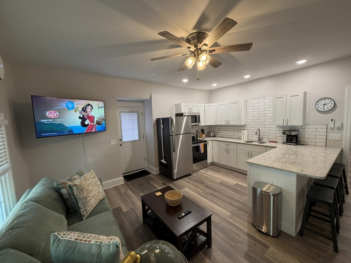 Relájate y desconecta en esta suite privada de lujo de dos habitaciones con una gran cocina con comedor y un dormitorio espacioso con una cama tamaño king con dosel y un increíble colchón PURPLE. El dormitorio también tiene un sofá de dos plazas. Ten en cuenta que este apartamento está en el segundo piso, hay que subir escaleras. La cocina está totalmente equipada con todo lo que necesitas para cocinar, ¡solo tienes que traer la comida y las bebidas! TV inteligente de ultra alta definición de 50 pulgadas con Roku incorporado y aparcamiento reservado.