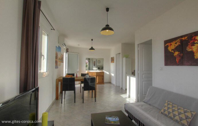 Tranquilo con excepcionales vistas a la playa. Aire acondicionado y wifi. Cocina totalmente equipada abierta al salón (sofá cama, mesa de centro, TV de pantalla plana, mesa, sillas). Dos dormitorios con vestidor: 1 con 1 cama de 160, el otro con 2 camas de 90. Cuarto de baño con ducha, inodoro y lavabo. Amplia terraza amueblada donde se puede comer con unas vistas inmejorables de la playa de Péro y la torre de Omigna. Aparcamiento privado. El centro del pueblo está a 400 metros y se puede llegar a pie.