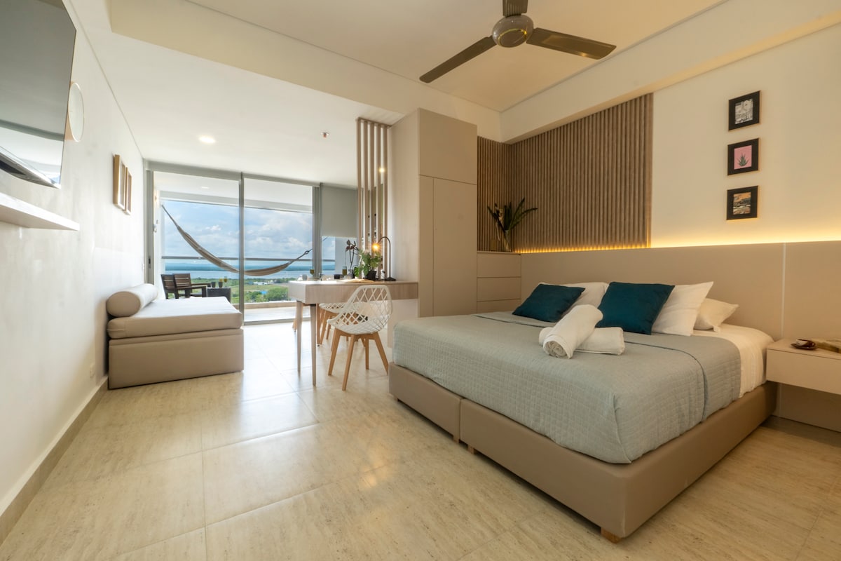El lugar perfecto para disfrutar del lujo y la tranquilidad en Cartagena. Nuestra suite ofrece un ambiente exclusivo único con vistas frente a la playa del magnífico océano Caribe. Nuestra unidad ha sido diseñada para huéspedes que buscan disfrutar de la combinación perfecta entre ambientes zen y de alta gama. Escucha el chapoteo de las olas cuando te despiertes y cuando estés listo para un sueño profundo. Este moderno edificio también cuenta con servicios de primer nivel como gimnasio, jacuzzi y su popular piscina infinita con impresionantes vistas.