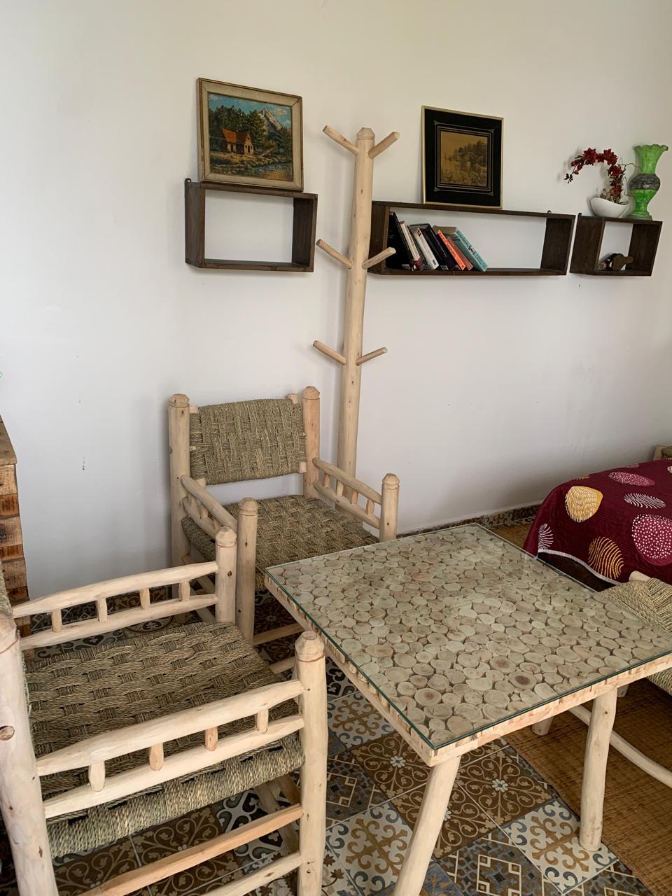 La habitación en el primer piso de la casa de huéspedes en El Jadida es una opción cómoda y conveniente para los viajeros. Aquí hay una descripción actualizada de esta habitación: La habitación, con una superficie de unos 12 m2, se encuentra en el primer piso y tiene una ventana con agradables vistas de los alrededores. Está amueblada con una cama espaciosa que mide 1,90x1,45 m . Se proporcionan sábanas limpias y suaves para garantizar un sueño cómodo durante su estadía y dos sillas y una mesa.