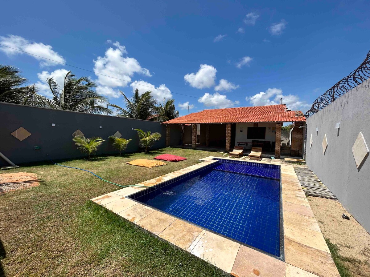 Enjoy your own private paradise on the beach! Our yard is landscaped with fruit tress, a grassy area and a swimming pool that invites relaxation. The home is spacious, well-maintained, and equipped with all you need to have a memorable stay. Conveniently located at the division of the beaches of Caponga and Aguas Belas, the house is a 5-min walk from the ocean and less than a 5-min drive to the picturesque meeting of the waters, a local attraction.