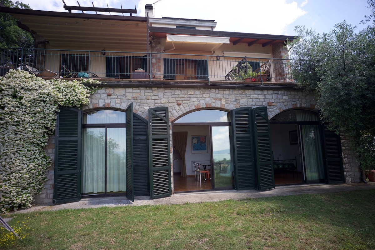 Edificio bioecologico in doppia classe A, energetica ed ambientale, costituito da due appartamenti, uno al piano terra e l'altro al piano primo. Viene locato quello al piano primo, costituito da ingresso indipendente, Cucina/pranzo/soggiorno,terrazza,camera matrimoniale e bagno. Vista lago a 180 gradi, con piscina e spazio verde esterno. La piscina è privata ed è condivisa con la proprietà. SE IL PERIODO DA VOI SCELTO FOSSE OCCUPATO, CONTATTATEMI, TROVEREMO UNA SOLUZIONE