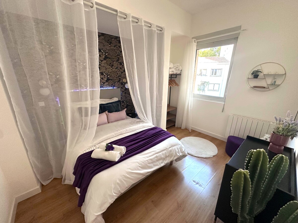 Dans notre grande propriété nous vous proposons un appartement pour se retrouver en couple, en famille, entre amis. Il est composé d'une seule pièce à vivre avec un coin chambre avec lit 160×200, d'une cuisine équipée, d'un coin zen avec le Jaccuzi, d'un coin TV avec canapé convertible, d'une salle de bain avec douche et d'un espace extérieur. Possibilité de réservation de paniers repas 50€ pour 2 et des petits déjeuners 7€/pers. Proche de la cité et du canal, 10 min du centre ville.