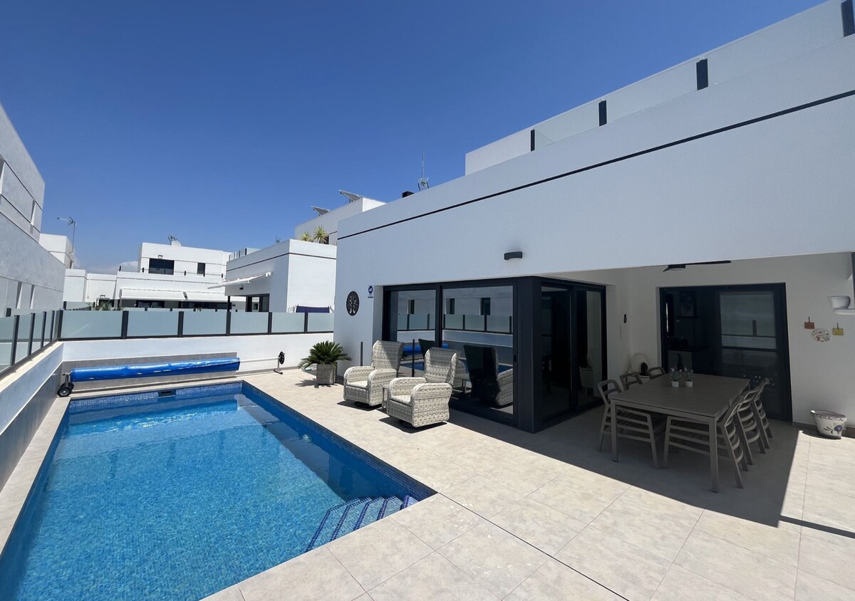 Villa con piscina privada y terraza en la azotea. El alojamiento contiene 3 dormitorios dobles, sala de estar, cocina, lavadero y 2 baños (1 dormitorio y 1 baño están bloqueados para los propietarios no actuales). Fibra óptica de 50 Mbps, TV, altavoz Bluetooth para música o radio. Cocina totalmente equipada, zona de barbacoa exterior y áreas de chill-out a la sombra. A 25 minutos del aeropuerto, a 10 minutos de las playas de "bandera azul". Hay unos 50 bares y restaurantes en la zona. El área más cercana está a 450 metros de la villa.