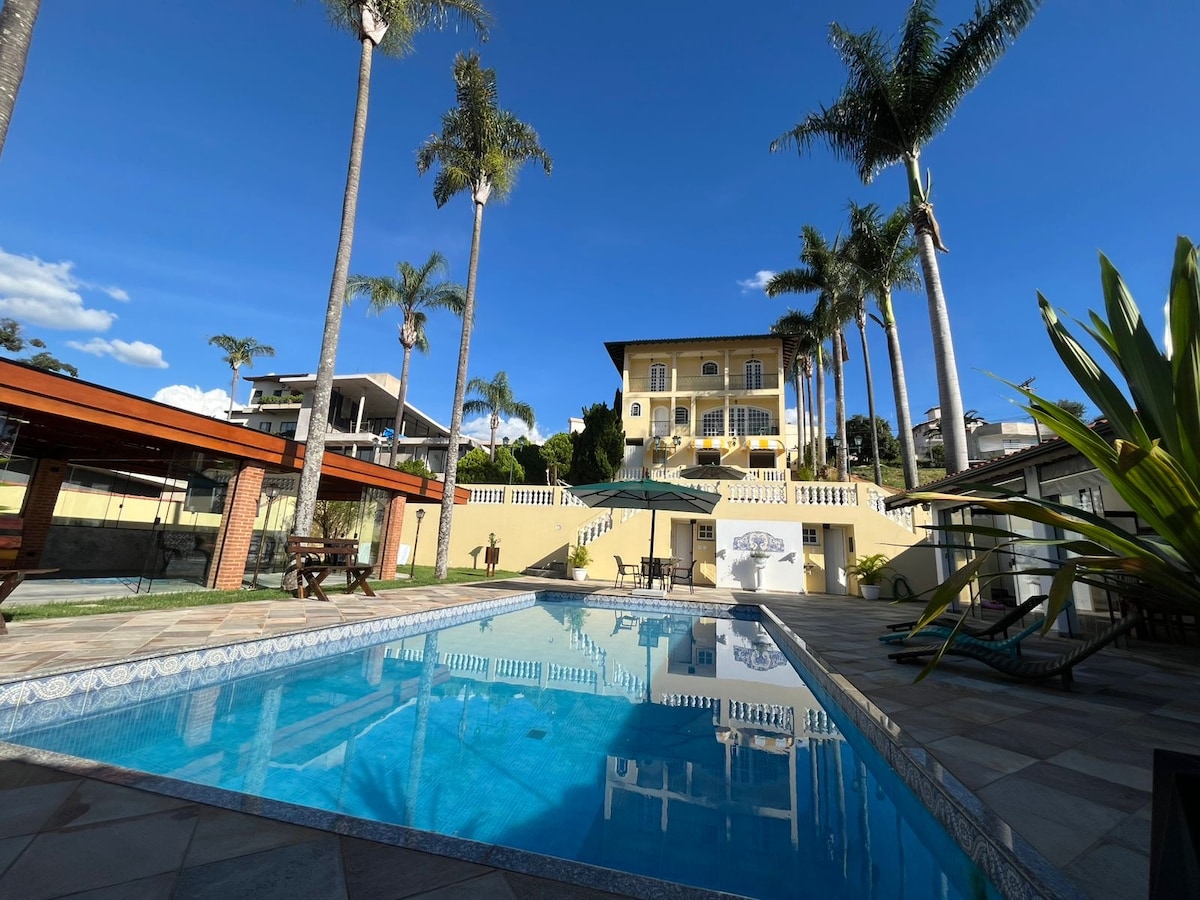 Fines de Semana Linda Chácara en Serra Negra * 6 dormitorios con ventilador de techo, hasta 20 personas * 9 baños * 3 bañeras de hidromasaje * Sala con chimenea * Cocina * 2 zonas de barbacoa * Estufa de leña * Horno de barro para pizza * Piscina climatizada (calefacción solar) con cascada e hidromasaje * Cancha de fútbol y voleibol * Sala de juegos (billar, futbolín y ping pong) * Wi-Fi de fibra óptica * Perrera * Sauna seca y húmeda * Lago para la pesca de tilapia * Asfalto hasta la puerta * Parque infantil para niños