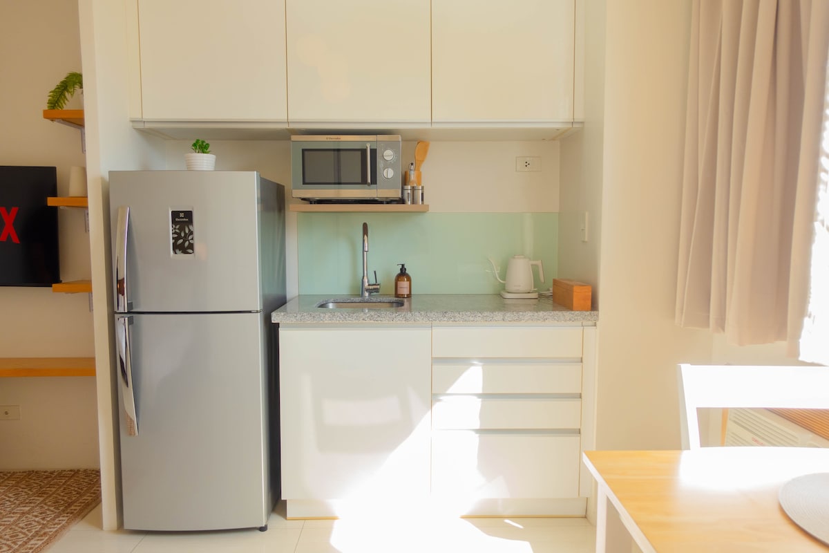 Un estudio luminoso de inspiración mediterránea en Baseline Prestige, en la zona residencial de Cebú, diseñado para disfrutar de la ciudad y de escapadas a la isla. Despiértate con suaves tonos costeros, trabaja en fibra rápida y luego camina a cafés, centros comerciales y hospitales a pocos minutos de distancia. Comodidad de hotel con detalles prácticos: agua potable filtrada, ducha caliente y cocina americana totalmente equipada.