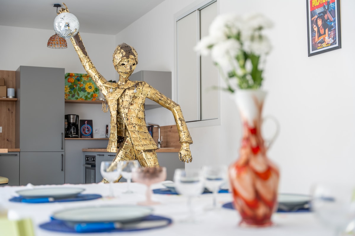 Profitez d'un logement refait à neuf et décoré dans le thème des Années Disco. Ce logement bien équipé, situé au cœur de Bessé sur Braye, vous offre la possibilité de participer aux festivités sans avoir à prendre la voiture. Il n’est qu’à 2 minutes à pied de la salle des fêtes. Vous bénéficiez d’une place de parking et le stationnement dans la ville est gratuit. L'appartement mesure plus de 42 m², il est très lumineux et calme. Il se situe au rez-de-chaussée.