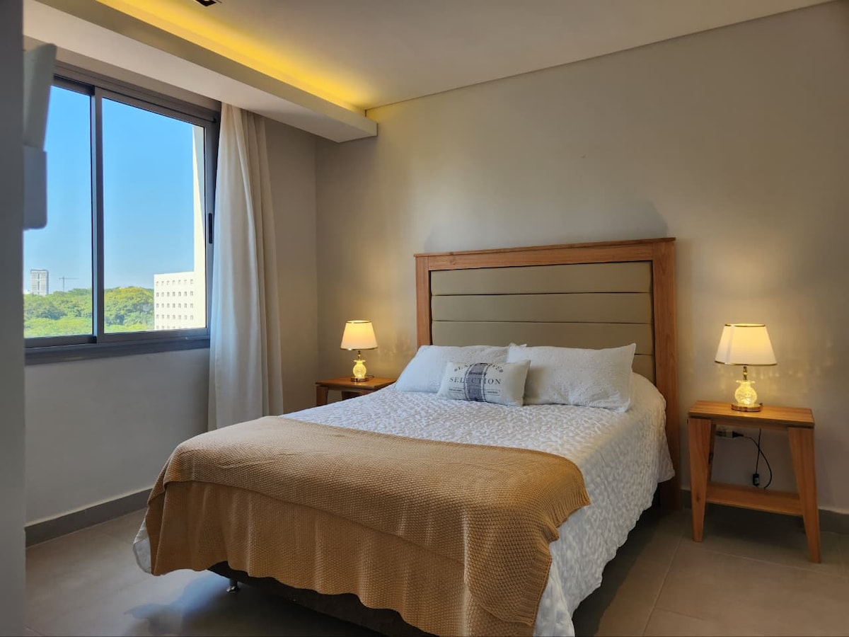 Departamento ubicado en un piso alto, con balcón y vista despejada, totalmente equipado para una estadía cómoda: - Cama king con colchón firme de alta densidad - Espacio de trabajo con escritorio y conexión WiFi - Smart TV de 55'' - Rooftop con piscina y gimnasio - Quincho - Lavandería - Seguridad las 24 horas Ubicación excepcional: - Situado en el Eje Corporativo, a solo 5 minutos del Shopping del Sol y Paseo La Galería - A 15 minutos del Aeropuerto Internacional Silvio Pettirossi
