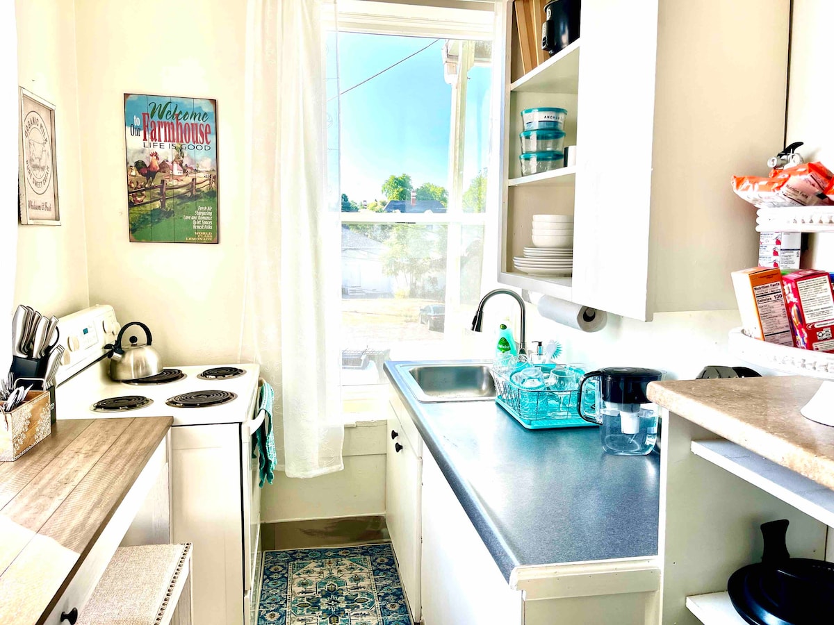 Edificio histórico de 1906, segundo piso, 1 dormitorio, 1 baño, cocina pequeña, muebles y decoración de estilo occidental nuevos, aire acondicionado, calefacción, entrada con código, estacionamiento en el lugar y en la calle, a pocos pasos de restaurantes, oficina de correos, tiendas, bares; a 1/2 milla de la autopista I-5; a 1 cuadra de Main St, antiguo juzgado y mercado de agricultores estacional los miércoles por la noche. Techos altos con vistas al centro de la ciudad. No se admiten mascotas, no se puede fumar ni lavar la ropa. Registro de entrada autónomo. Su cómoda ubicación en el centro de la ciudad significa que puedes escuchar el tráfico de la calle, la música de un bar local y el tren cercano.
