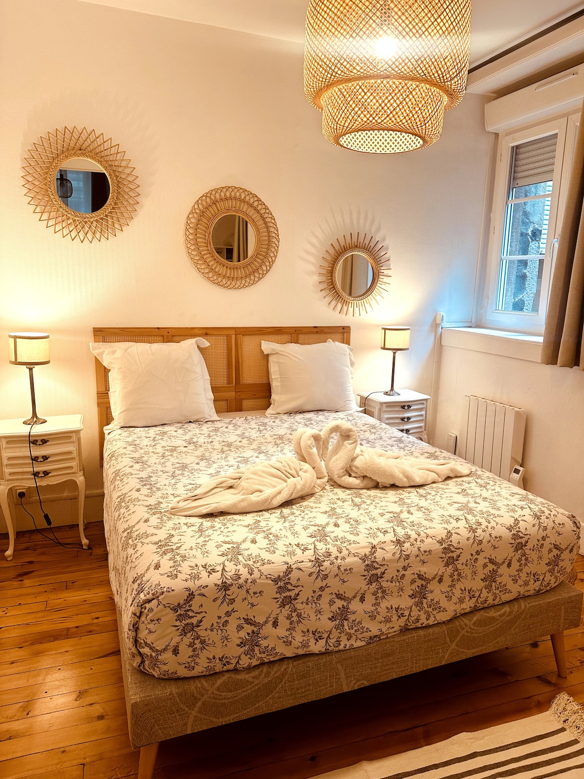 Relájese en este alojamiento único y tranquilo. Y disfruta de un agradable momento en el centro de la ciudad, con una pequeña terraza a disposición, pantalla grande con France 24, Molotov incluido. Y muchos otros Un desayuno le espera para completar esta agradable estancia y una cafetera Nespresso virtud más en el lugar para complacerle con el sabor del buen café. Un cuarto de baño con la bañera Jacob DELAFON será una ventaja .