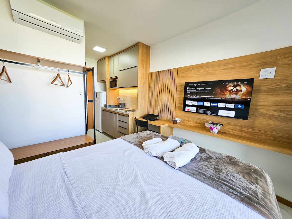 Studio moderno com design bem planejado, cores e acabamentos que criam um ambiente acolhedor e funcional. A 10 min a pé do Centro de Convenções, ideal para quem busca praticidade sem abrir mão de conforto. ✔ Wi-Fi estável para trabalho ✔ Ar-condicionado em todo o ambiente ✔ Cozinha equipada + enxoval completo ✔ Self check-in com fechadura eletrônica ✔ Portaria 24h Prédio com rooftop, piscina, academia com vista mar, coworking e salas de reunião. Próximo à praia, restaurantes e serviços.
