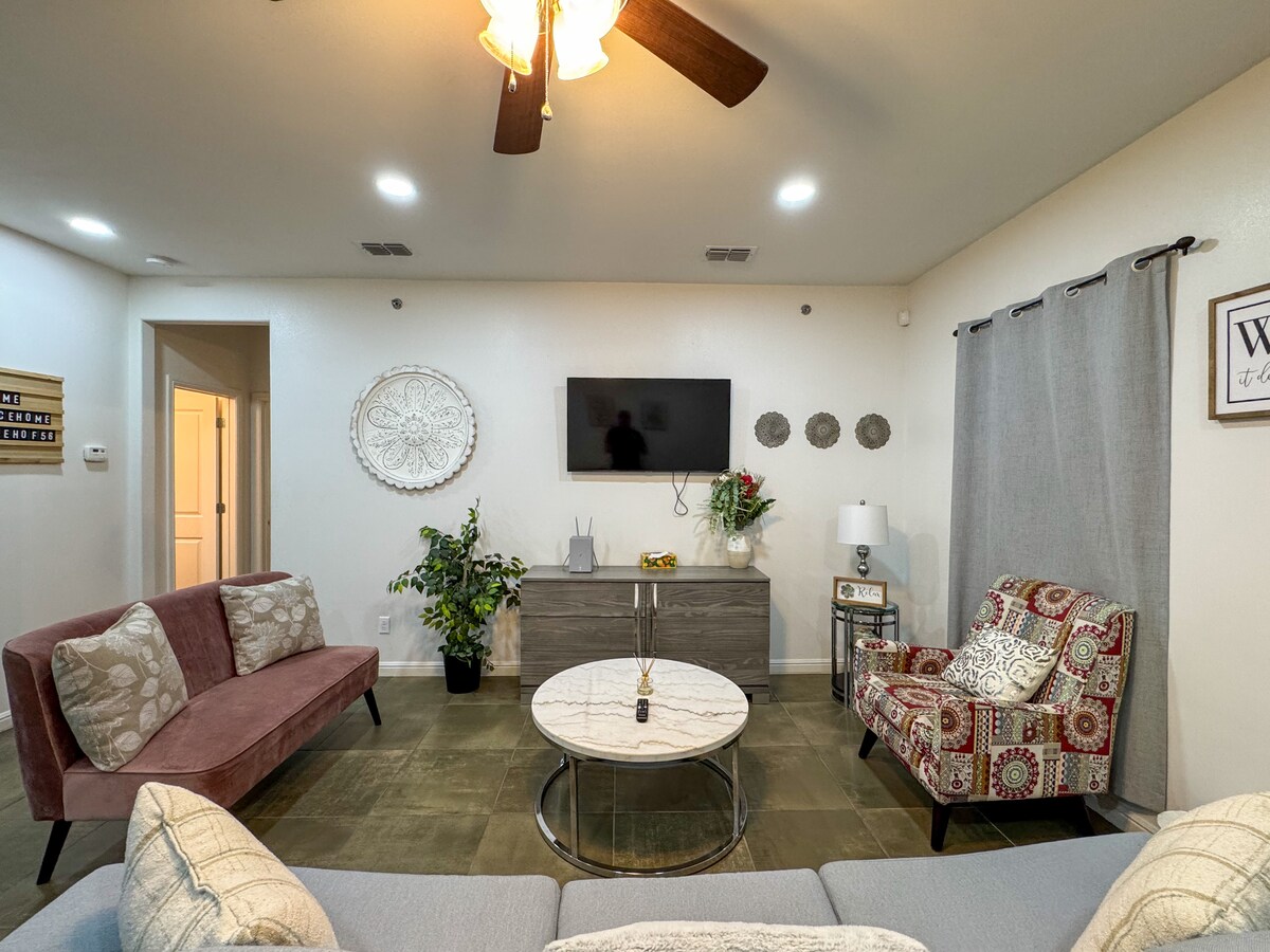 Welcome to Casa Sol! ☀️ Enjoy charm and comfort in this updated 3BR/2BA farmhouse-style home in the heart of Edinburg. Features include high-speed Wi-Fi, 4 Smart TV’s, a full kitchen, and a backyard grill—perfect for relaxing or entertaining. Located in a quiet residential neighborhood, with Monte Cristo Golf & Country Club just behind the community. Only 8 miles to Bert Ogden Arena and 5 miles to UTRGV Football Stadium, Casa Sol offers space, style, and true South Texas hospitality.