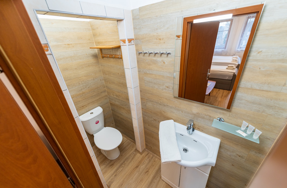 Amplias habitaciones que cuentan con: 2 dormitorios - vistas al jardín y un parque infantil - muebles de hierro forjado - Oun badroom con ducha, inodoro, torres, champú, jabón y artículos de tocador - rincón para niños con juguetes. El primer dormitorio es con una gran cama de matrimonio y entrada al baño. La segunda habitación tiene 2 camas individuales. Sal de la ubicación cerca del centro de la ciudad. - A unos 10 minutos a pie del centro de la ciudad a 500 m. El castillo está a unos 5 minutos a pie de 300 metros . La estación de Špičak está a unos 10 minutos a pie.