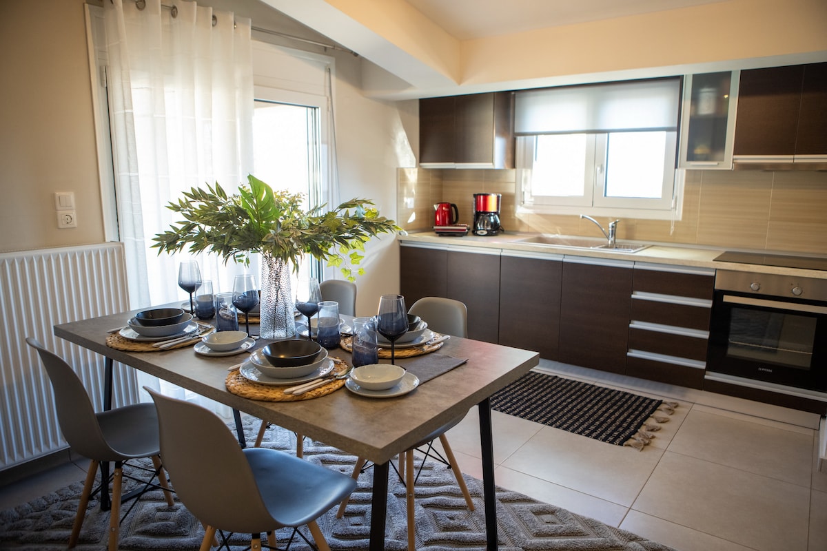 Este elegante y soleado apartamento de 100 m2 está situado en el casco antiguo de Kalampaka. ¡Se encuentra en un hermoso paisaje rodeado de árboles con una impresionante vista a la terraza de las famosas Rocas de Meteora!Al alojarte aquí, tienes un gran acceso a la zona comercial de Kalampaka (restaurantes, panaderías, cafeterías, bancos, oficina de correos, etc.), ya que está a solo 5 minutos del centro de la ciudad. ¡Se encuentra en un barrio tranquilo y cómodo para llegar a los mejores lugares de Kalampaka e incluso explorar Meteora a pie! La ubicación clave, la limpieza profesional y la decoración elegante lo hacen adecuado para todos los huéspedes.