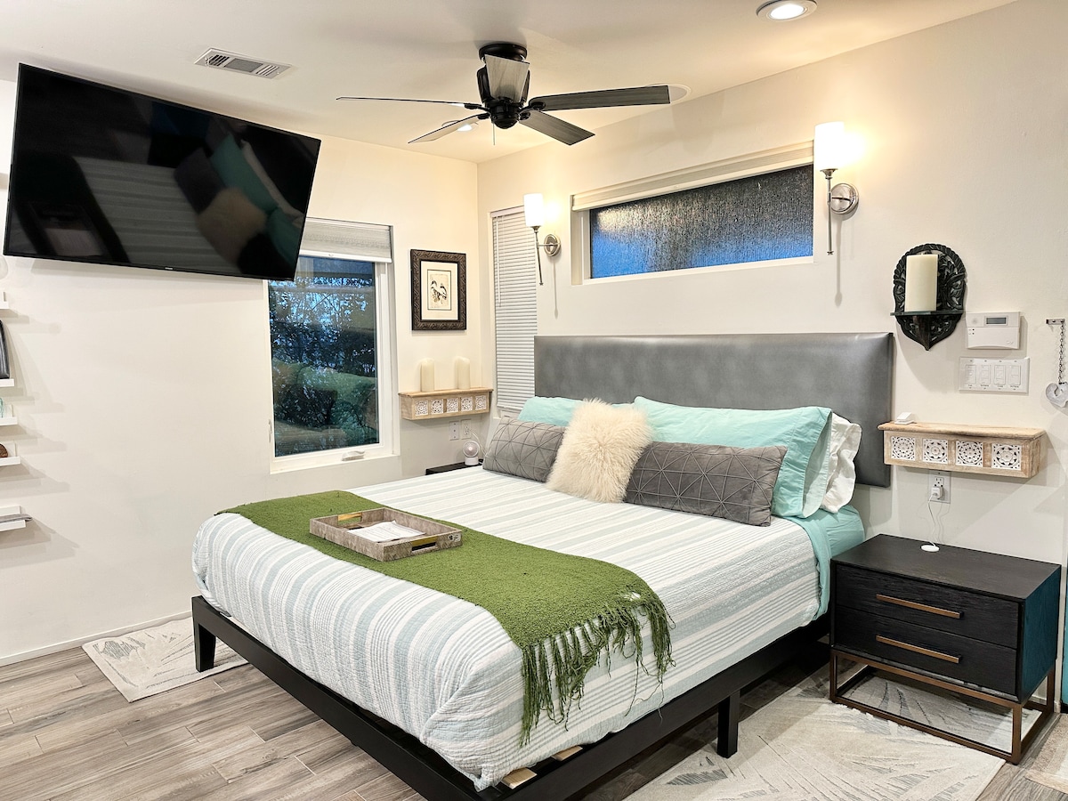 Ven a disfrutar de nuestro oasis en el patio trasero. Somos adultos solo patio trasero compartido, ropa opcional donde puedes disfrutar de nuestra palapa exterior con cocina completa, cocina, nevera, máquina de hielo comercial, parrilla de gas Weber, chimenea de gas, chimenea con zona de estar, spa climatizado para 12 personas, piscina climatizada opcional, baño exterior con ducha fría/caliente. Dentro de tu casita privada con cocina completa, colchón tamaño queen con la parte superior acolchada. Solo hay 2 huéspedes en tu unidad. No se permiten huéspedes adicionales.