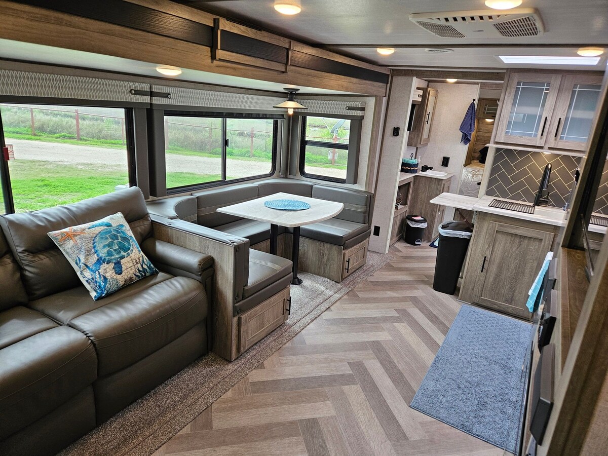 Welcome to your family’s next beachside adventure! Tucked along a peaceful canal on the bay side, this spacious Wildwood Heritage Glen bumper pull offers serene views of the Intracoastal Waterway in one direction and the sparkling Gulf of America in the other, perfect for a relaxing, memory making getaway. The space This thoughtfully designed RV sleeps up to 8 guests and features a private queen master bedroom, a cozy second bedroom with a bunk bed, perfect for kids or extended family, and a queen pull out bed in the living room for additional guests. The open living space includes a Smart TV and ample room to gather after a sun-soaked day. The fully stocked kitchen is equipped with all the essentials for easy, home cooked meals, with plenty of dining space for everyone to enjoy. Step outside to unwind by your private fire pit or take advantage of the resort style amenities: a fishing dock, crab traps, kayaks, bicycles, a huge pirate ship playground, and a brand new palapa area with a grill, picnic tables, and corn hole. Whether you’re watching the sunset over the water, roasting marshmallows under the stars, or setting out on a canal kayak adventure, this family friendly haven is the perfect coastal escape.