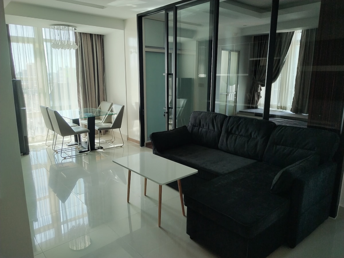 Esta propiedad especial se encuentra en una ubicación perfecta en el centro de la ciudad. Frente al apartamento hay un gran centro comercial y el hotel de cinco estrellas Sofitel, que es conveniente para que planifiques tu visita. - Equipado con televisor inteligente Samsung. - Equipado con cocina , nevera y hervidor de agua. - Equipado con lavadora y percha para ropa. - El bar más alto del cielo de Johnom Penh: Celeste y la piscina infinita de la azotea con vistas al río Mekong. - Equipado con gimnasio. - Se proporcionan adyuvantes Equipada con artículos de aseo básicos