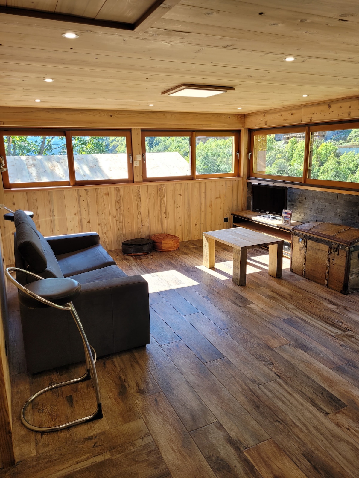 Ce logement affiche un style résolument unique. Logement pour 4 personnes disposant d'un spa avec bain à remous et sauna (partagé avec l'autre logement du chalet avec créneaux privatifs ) d'un espace extérieur avec barbecue et salon de jardin. Le lit queen size est en mezzanine au dessus du salon avec une petite hauteur sous plafond. La chambre dispose de 2 lits superposés. Le centre du village, les commerces, les remontées mécaniques, la piscine accessible en quelques minutes à pieds.