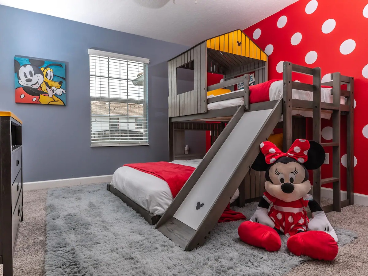 La casa de Mickey y Donald fue decorada pensando en la alegría y la amistad, principalmente con Mickey, Minnie, Donald y Daisy. Cada área de la casa es linda, elegante y divertida; algunos de los aspectos más destacados incluyen el adorable dormitorio de Donald y Daisy, y el magnífico mural de Mickey Mouse en el comedor. Hay algo para todos en la familia en esta vibrante casa que seguramente creará muchos recuerdos felices de vacaciones, también una cocina equipada, lavandería y acceso gratuito a 2 casas club.