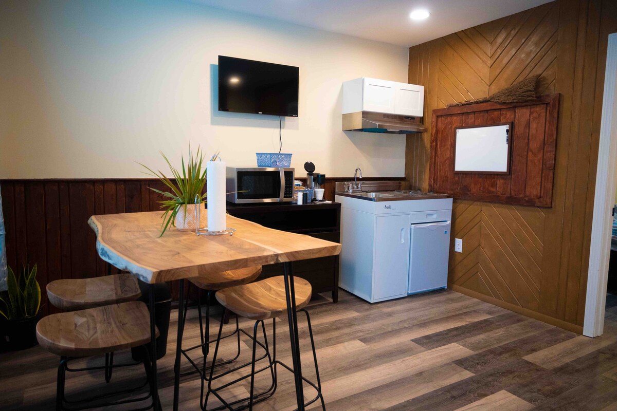 Ubicado en un barrio tranquilo cerca del centro de la ciudad. Entrada privada. Amplio dormitorio (14 X 11) con armario grande y cómoda. Sala de estar de concepto abierto (14 x 11) con sofá cama tamaño queen y mesa de comedor con 4 sillas. La pequeña cocina incluye una pequeña estufa eléctrica, nevera, microondas, horno tostador, platos y algunos utensilios de cocina y Crockpot. TV inteligente y wifi. Se proporcionan sábanas y toallas. Baño completo. NO SE ADMITEN MASCOTAS. No se permite fumar ni vapear en la propiedad.