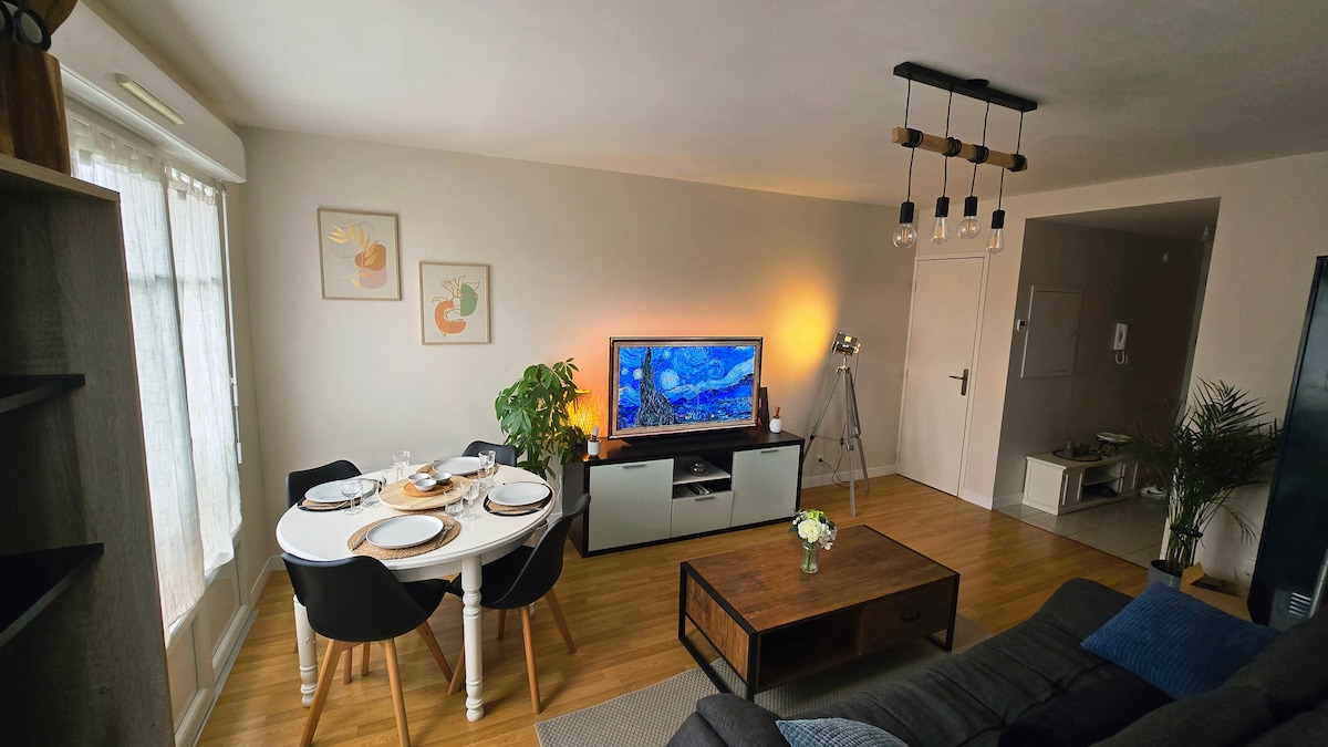 En el corazón de la ciudad, disfrute de mi hermoso y cálido apartamento de 76 m², cerca de todas las tiendas. Consta de una gran sala de estar/salón, cocina equipada (horno, placa de inducción, lavavajillas, tostadora, hervidor de agua...), dormitorio, baño, bañera, inodoro, lavadora, wifi de fibra, palitos de café, té y azúcar (sin cafetera). Aparcamiento gratuito y/o de pago cerca. Sábanas, toallas y artículos esenciales incluidos (excepto gel de ducha). Llegadas anticipadas y salidas tardías bajo condiciones.