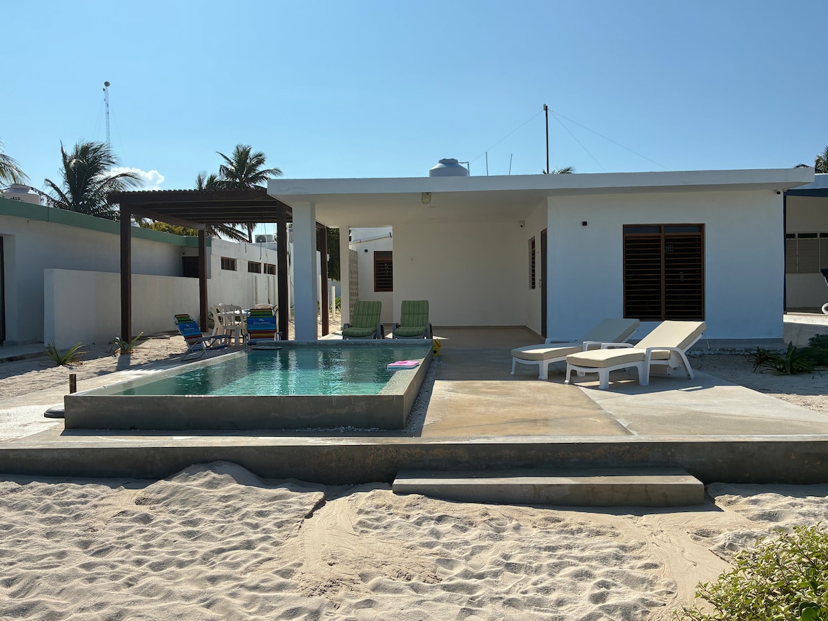 Esta bella casa en 2da fila a tan solo unos pasos de la playa cuenta con todas las amenidades para disfrutar tu estadía en la hermosa costa de Yucatán. Disfruta de unos días de playa inolvidables, relájate en nuestra piscina y toma el sol en los camastros, haz una carne asada al aire libre, o da un paseo hasta la playa que se encuentra a muy pocos pasos y donde podrás disfrutar de nadar y ver hermosos atardeceres. Te garantizamos que pasarás unos días de descanso y relajación inolvidables.