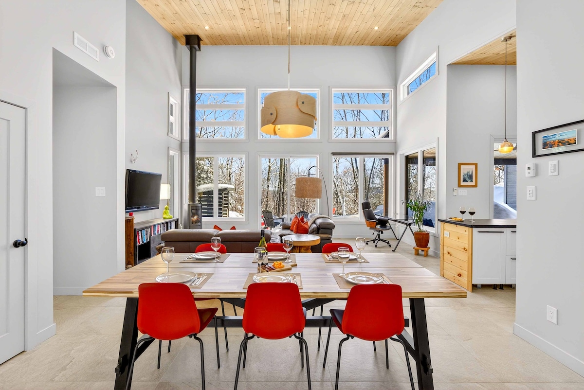 Escápate a un refugio forestal de lujo de estilo nórdico, recién construido en 2024 y ubicado en una finca privada cerca de Saint-André-Avellin. Esta moderna casa tiene capacidad para 8 personas y cuenta con ventanas del piso al techo, techos de catedral y 2 salas de estar: un espacio principal de concepto abierto con chimenea y una sala de entretenimiento separada con bar y futbolín. Disfruta de una sala privada al aire libre con calefacción y fogata, wifi de alta velocidad y fácil acceso a Montagnes Noires, Lac Simon, Parc Oméga y Mont-Tremblant.