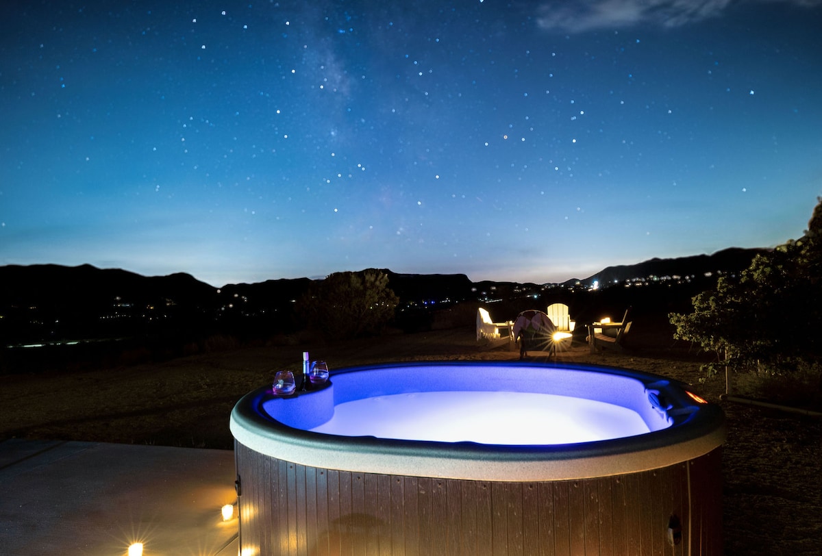 “Sphere In The Rocks” desert retreat w. cowboy pool, jacuzzi, fire pits, daybed, dining & BBQ! ★ “A magical space that encourages connection, reflection, and presence.”❤️ ✔️Architectural sound healing sphere ✔️ Recommendations → Concierge Chef & Sound Bath (ask us!) ✔️Fully equipped + stocked kitchen ✔️Reverse osmosis water filter ✔️Parking → driveway (4 cars) ✔️50 Mbps wifi + workspace ✔️Outdoor shower + tub + fire 3 mins → Joshua Tree National Park Entrance 10 mins → Downtown Joshua Tree