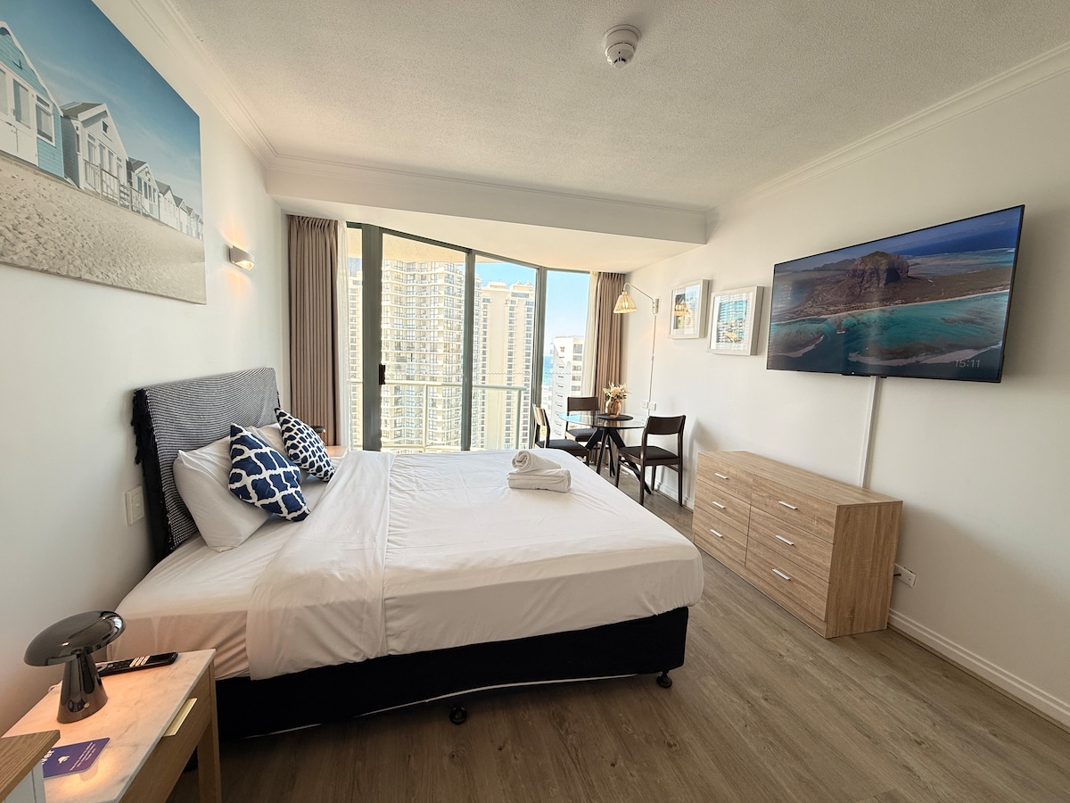 🌊 Wake Up by the Ocean – in the heart of Surfers Paradise Relax in this light-filled studio apartment, ideally located to explore the best of the Gold Coast! With the beach, cafes, restaurants and public transport just moments away, everything you need is right at your doorstep. It’s a comfortable and convenient space to unwind after a day of sun, sand and sightseeing, making it an easy base for a relaxed Gold Coast stay.
