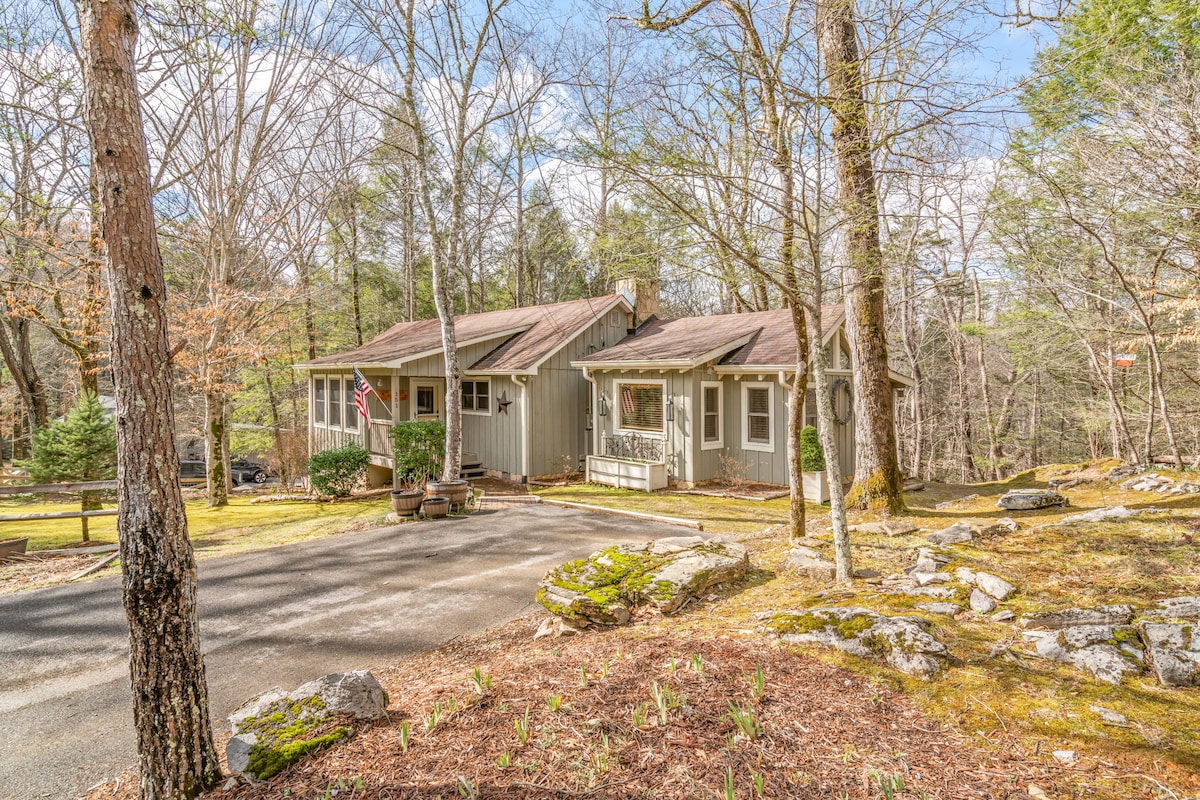 1 acre of private-peaceful bliss! New 65 in tv, linens, kitchen stock, washer/dryer, coffee pot, coffee, tea. Lots of towels, tons/pillows, throws/blankets ,Shampoo, conditioner, soap, jacuzzi, hot tub, covered porch, deck , fire pit, and so much more! You won’t have to leave! groceries delivered! Close to winery, coffee house, restaurants, you can walk , but feel like you are alone!! Cades Cove, Mountains within minutes! Biking trails, hiking, rafting and kayaking! Discounts, yes