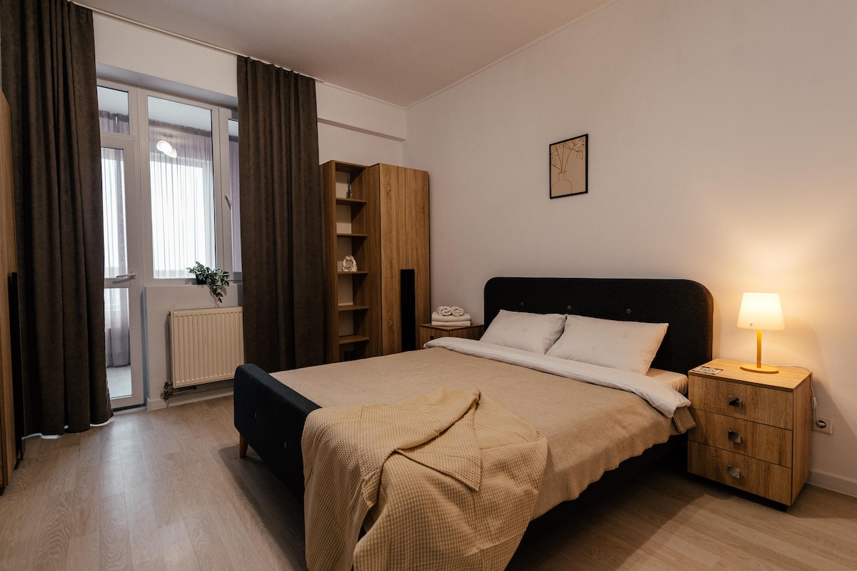 Apartament elegant și luminos, situat într-o zonă liniștită, dar centrală – la doar 5 minute de bulevardul principal și chiar lângă Parcul Memorial. Acest apartament de 2 camere oferă tot confortul de care ai nevoie: spații generoase, aer condiționat în întreg apartamentul, bucătărie complet echipată (inclusiv mașină de spălat vase, aparat de cafea, ustensile), mașină de spălat și uscător de haine, Wi-Fi rapid și Smart TV. Oaspeții beneficiază de self check-in prin cutie securizată
