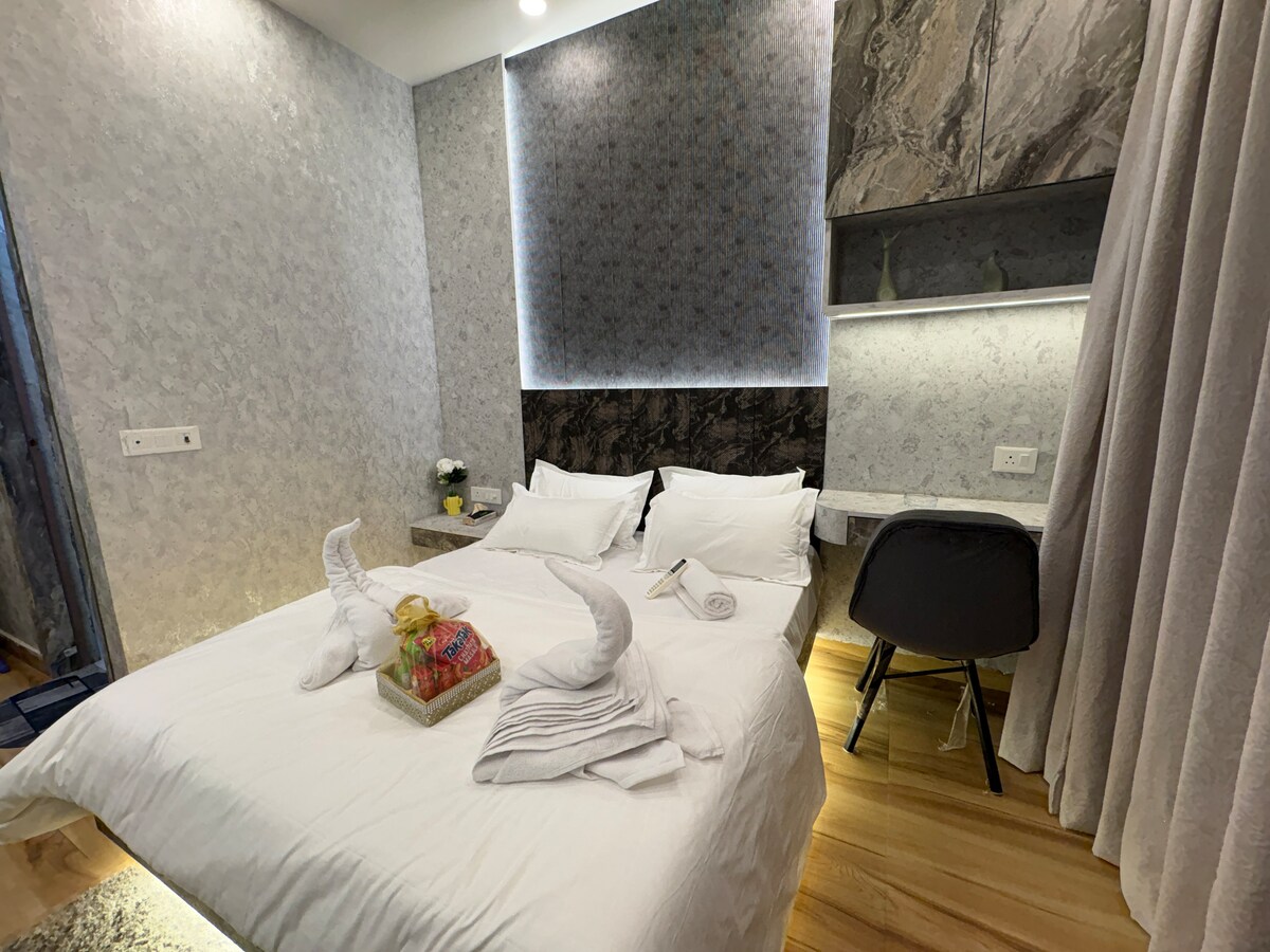 El primer apartamento de 2 Bhk que cumple con todos los requisitos ✨ - 2 dormitorios ( dormitorio principal, segundo dormitorio). - Dos camas tamaño king. - Una amplia sala de estar con una cómoda disposición de asientos. - 2 baños ( 1 en cada uno de los dormitorios). - Cocina pequeña (con todos los utensilios básicos de cocina disponibles y servicios abastecidos, es el lugar perfecto para preparar tus comidas favoritas) - Una zona de balcón compartido que conecta con el apartamento, que puede ser el espacio perfecto para tus paseos nocturnos. ¡Reserva ahora!