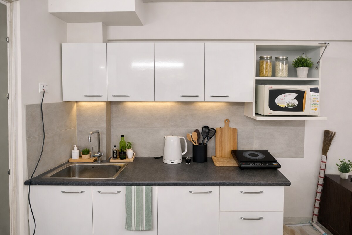 Adéntrate en un mundo de encanto contemporáneo refinado. Este apartamento de 525 pies cuadrados cuidadosamente diseñado ofrece una mezcla perfecta de estilo y funcionalidad, perfecto para viajeros y profesionales de negocios que buscan alojarse en un lugar cerca del aeropuerto. Ubicación y accesibilidad: 1. Aeropuerto IGI: 25 minutos(aprox. 19 km). 2. Centro de convenciones de Yashobhoomi: a 20 min(aprox. 12 km). 3. Estación de metro Dwarka Sector 21: a 15 minutos (aprox. 9 km). 4. Estación de tren de Gurgaon: a 20 minutos en auto (aprox. 12 km).